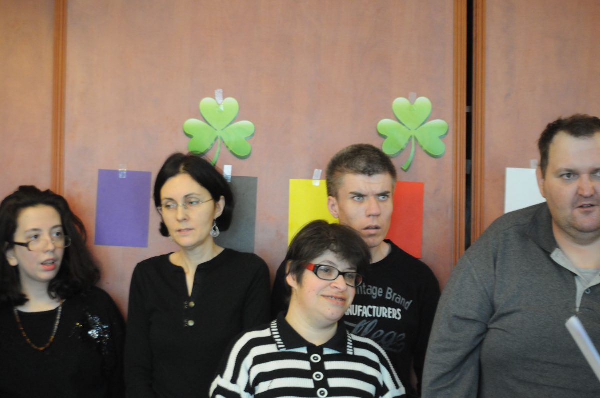 Natomiast ostatniego dnia lutego po obiedzie spotkaliśmy się w pięknie udekorowanej sali rekreacji, aby świętować urodziny osób urodzonych w lutym.  Zaprosiliśmy  jubilatów z lutego: Żanetę, Anitę, Jarka, Wojtka i Darka na środek Sali, zaśpiewaliśmy im „Sto lat!” i zrobiliśmy kilka pamiątkowych zdjęć. Dla jubilatów zaplanowane były zagadki – odgadywali prezentowane na przygotowanych filmach tańce. Był to walc, samba i tango.